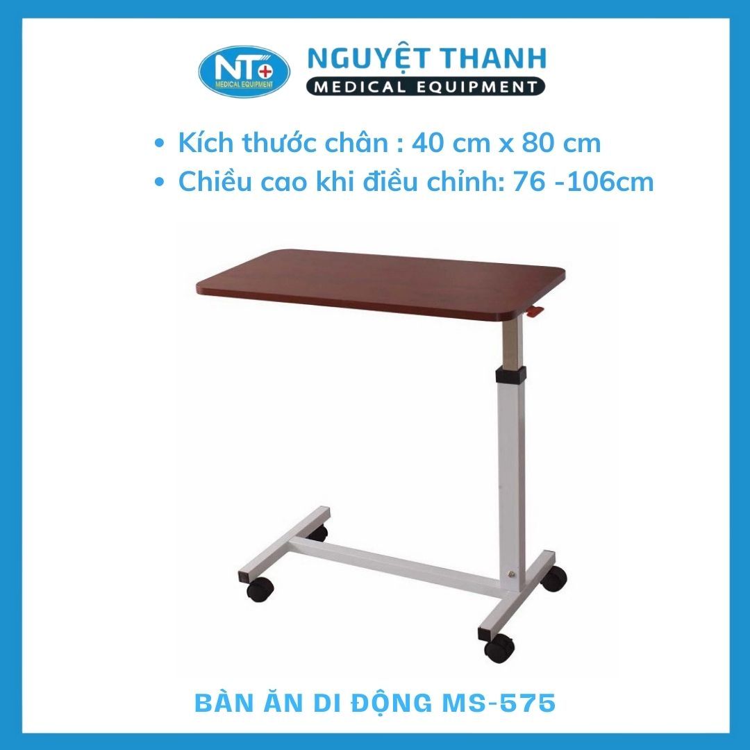 Bàn ăn di động MS-575 là giải pháp tiện lợi, hỗ trợ tối đa cho người già, người bệnh trong việc ăn uống và sinh hoạt. Với thiết kế thông minh, khả năng nâng hạ chiều cao tự động linh hoạt và 4 bánh xe có khóa cố định, bàn dễ dàng di chuyển và kéo vào sát giường bệnh, mang lại cảm giác thoải mái, giúp người dùng tiết kiệm sức lực hơn so với các loại bàn nâng thủ công. Sản phẩm này hiện đang được Thiết Bị Y Tế Nguyệt Thanh Cần Thơ phân phối trên toàn quốc.
