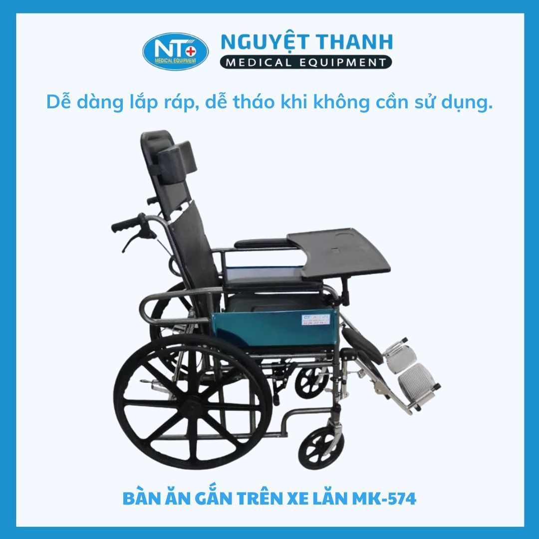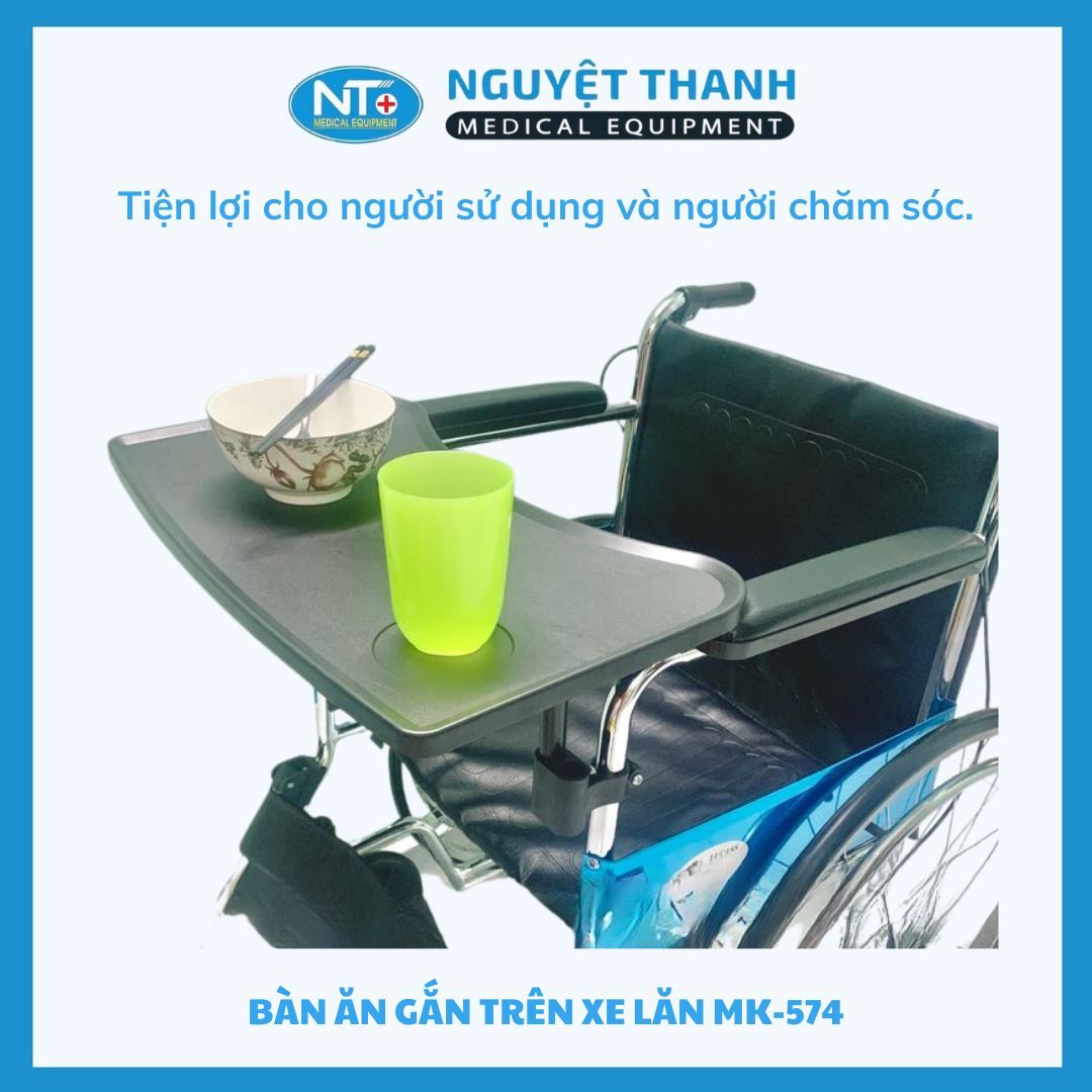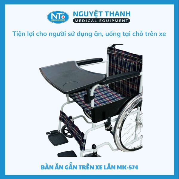 Bàn ăn gắn trên xe lăn MK-574 là giải pháp hỗ trợ thiết thực, cung cấp một không gian cố định, rộng rãi để người dùng xe lăn thực hiện các sinh hoạt cá nhân như ăn uống, đọc sách, hay làm việc. Sản phẩm giúp tăng tính tự chủ, giảm sự phụ thuộc và nâng cao chất lượng cuộc sống cho người bệnh và người cao tuổi. Sản phẩm này hiện đang được Thiết Bị Y Tế Nguyệt Thanh Cần Thơ phân phối trên toàn quốc.
