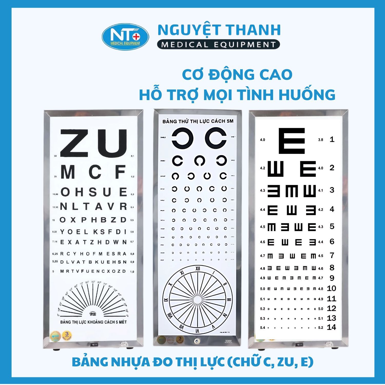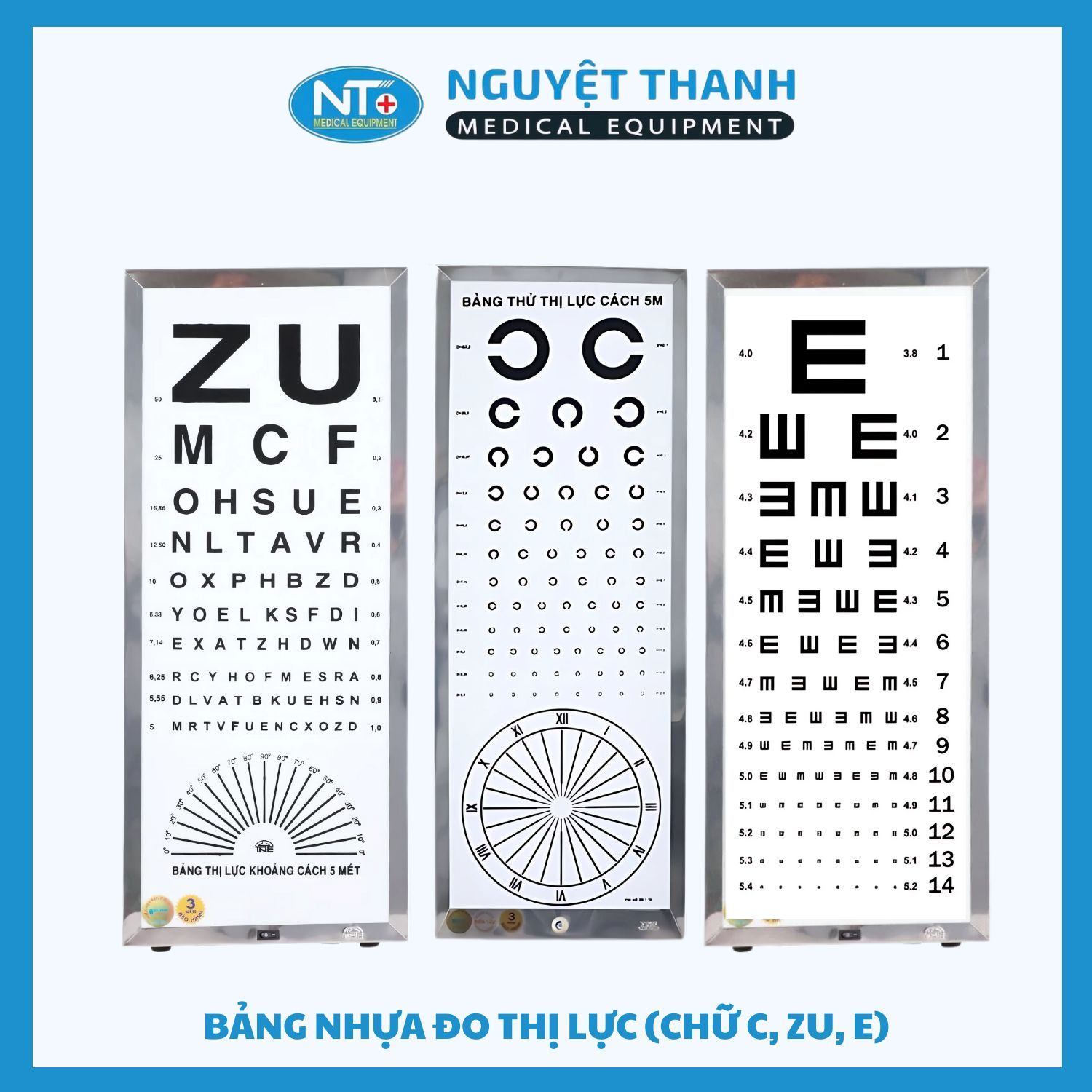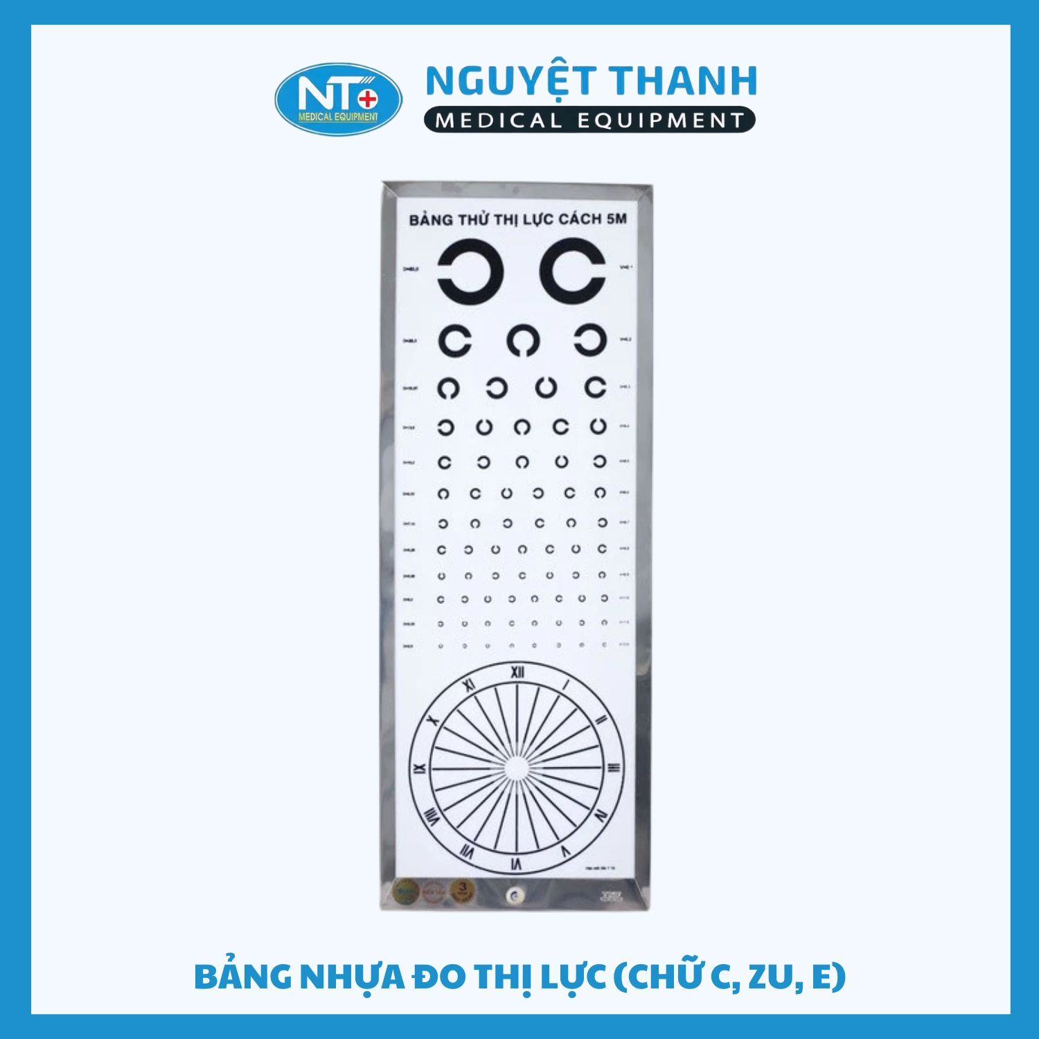 Bảng nhựa đo thị lực với hai phiên bản chữ C (Landolt C) hoặc chữ ZU (E-chart) là thiết bị cơ bản và cần thiết cho việc đánh giá và kiểm tra thị lực một cách nhanh chóng, dễ dàng. Sản phẩm được làm từ chất liệu nhựa mika trắng bền đẹp, rõ nét, phù hợp sử dụng tại phòng khám, phòng y tế hoặc tự kiểm tra tại nhà. Sản phẩm này hiện đang được Thiết Bị Y Tế Nguyệt Thanh Cần Thơ phân phối trên toàn quốc.