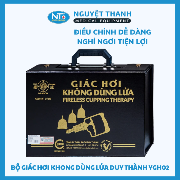 Giác hơi YGH02 là bộ dụng cụ giác hơi chân không thế hệ mới của thương hiệu Duy Thành, được thiết kế để thay thế phương pháp giác hơi bằng lửa truyền thống. Sản phẩm sử dụng lực hút chân không để tác động lên các huyệt đạo, giúp giảm nhanh các triệu chứng đau mỏi và hỗ trợ tăng cường sức khỏe. Sản phẩm này hiện đang được Thiết Bị Y Tế Nguyệt Thanh Cần Thơ phân phối trên toàn quốc.