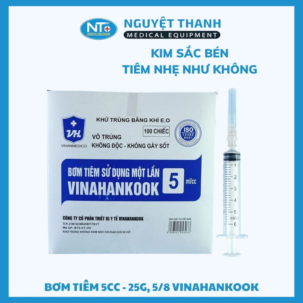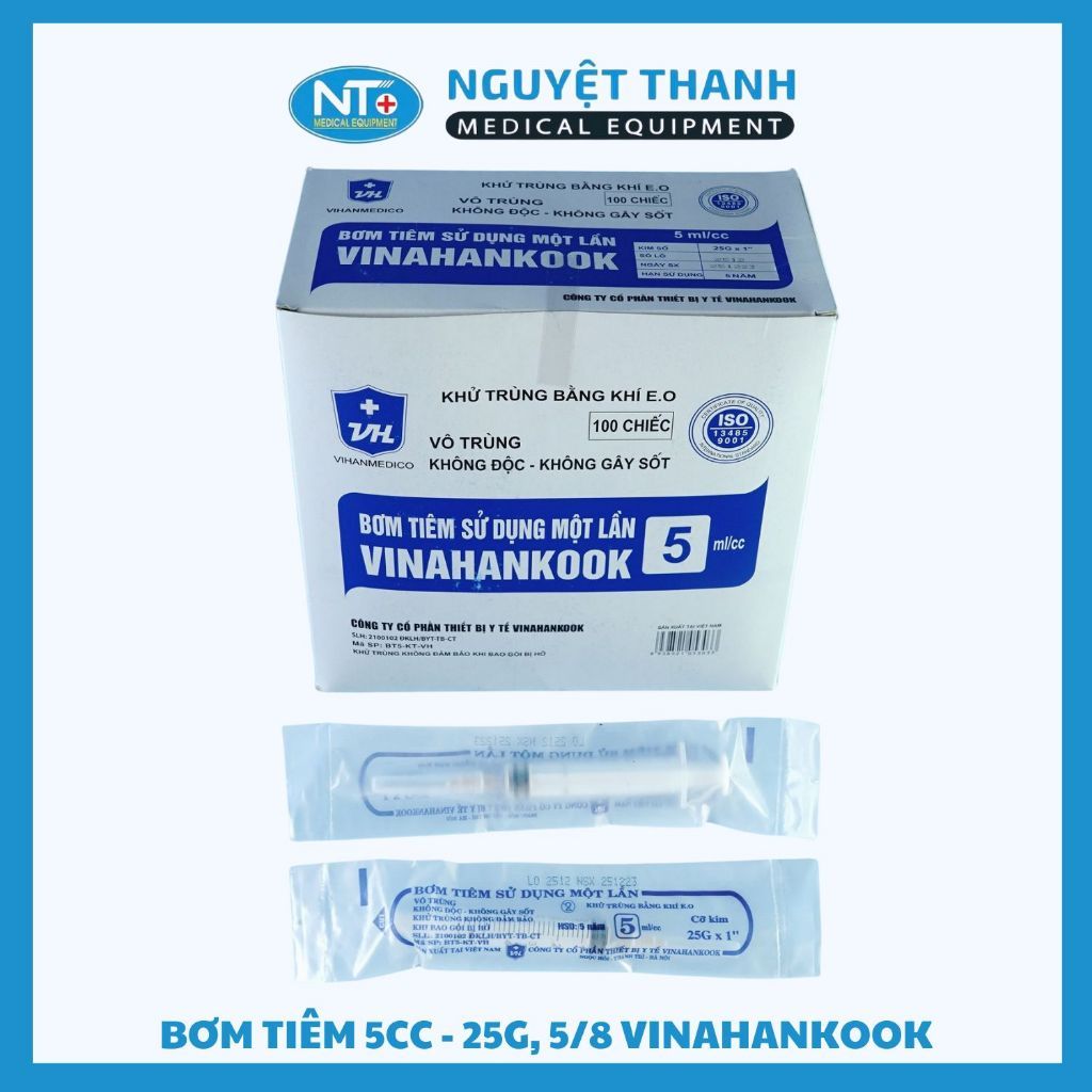 Bơm tiêm 5cc Vinahankook, kim 25G, 23G, 5/8 tiệt trùng bằng khí E.O, hộp 100 cái
