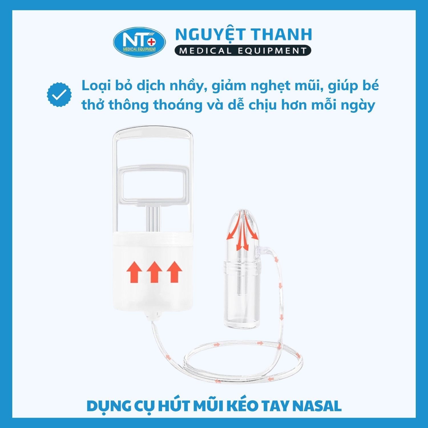 Dụng cụ hút mũi kéo tay Nasal là sản phẩm chăm sóc sức khỏe thiết yếu cho trẻ sơ sinh và trẻ nhỏ trong giai đoạn dễ bị cảm lạnh, nghẹt mũi. Với thiết kế thông minh, dễ sử dụng và an toàn cho bé, sản phẩm giúp loại bỏ dịch nhầy trong khoang mũi một cách nhẹ nhàng, hỗ trợ bé thở dễ dàng và ngủ ngon hơn. Sản phẩm này hiện đang được Thiết Bị Y Tế Nguyệt Thanh Cần Thơ phân phối trên toàn quốc.