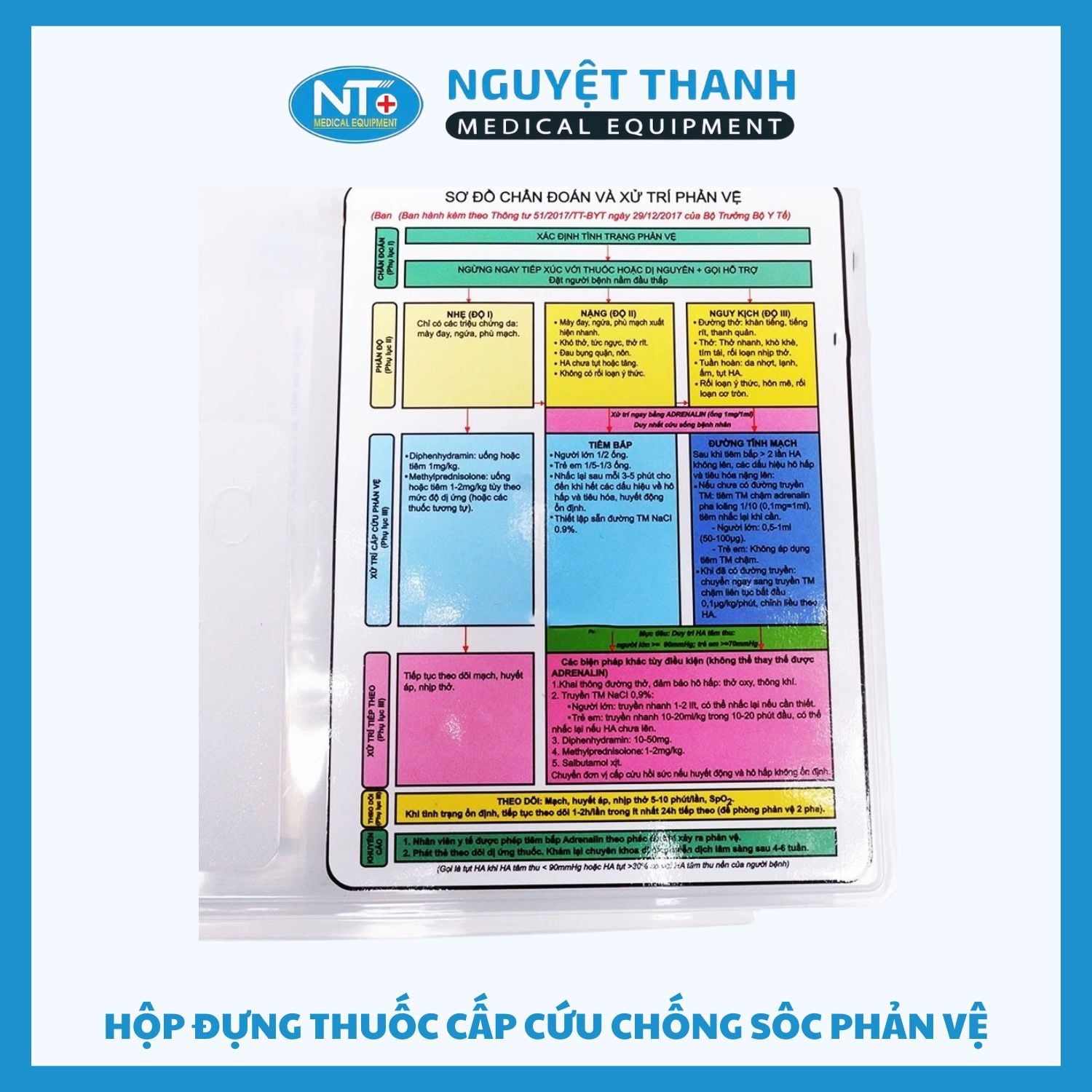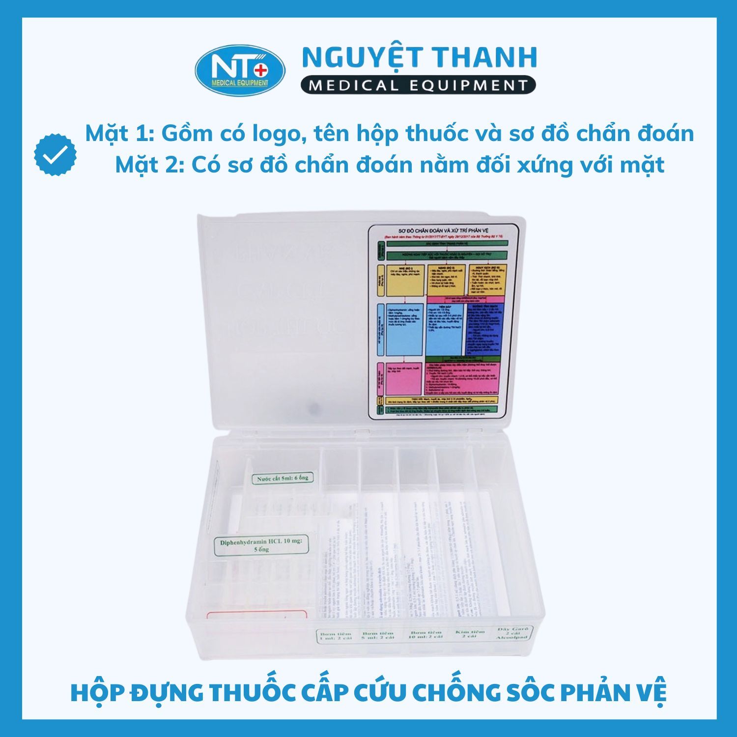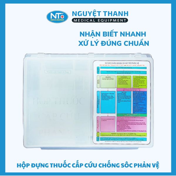 Hộp đựng thuốc cấp cứu chống sốc phản vệ là thiết bị y tế chuyên dụng không thể thiếu tại các cơ sở y tế, giúp lưu trữ và sắp xếp các loại thuốc, vật tư thiết yếu theo đúng phác đồ. Với thiết kế ngăn chia khoa học và tích hợp sẵn sơ đồ chẩn đoán, sản phẩm hỗ trợ nhân viên y tế thao tác nhanh chóng, chính xác trong các tình huống khẩn cấp. Sản phẩm này hiện đang được Thiết Bị Y Tế Nguyệt Thanh Cần Thơ phân phối trên toàn quốc.