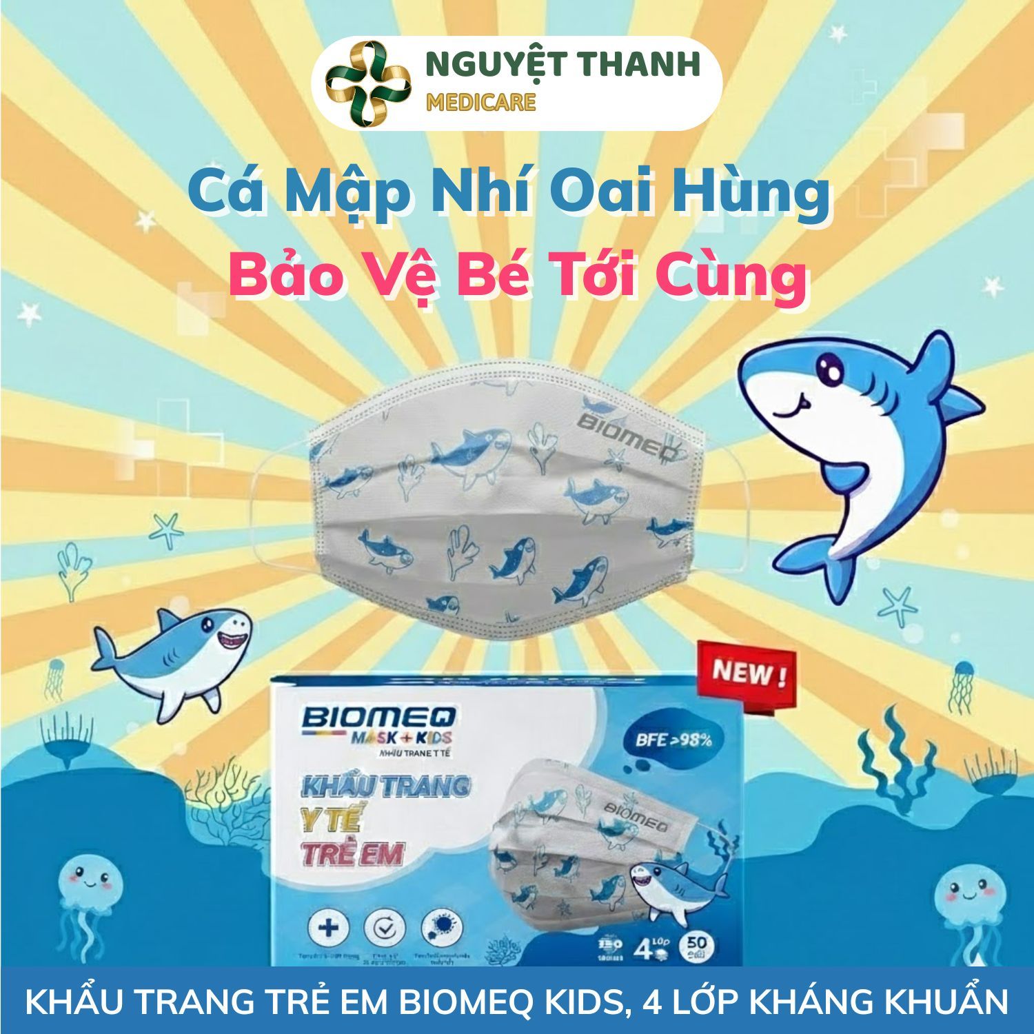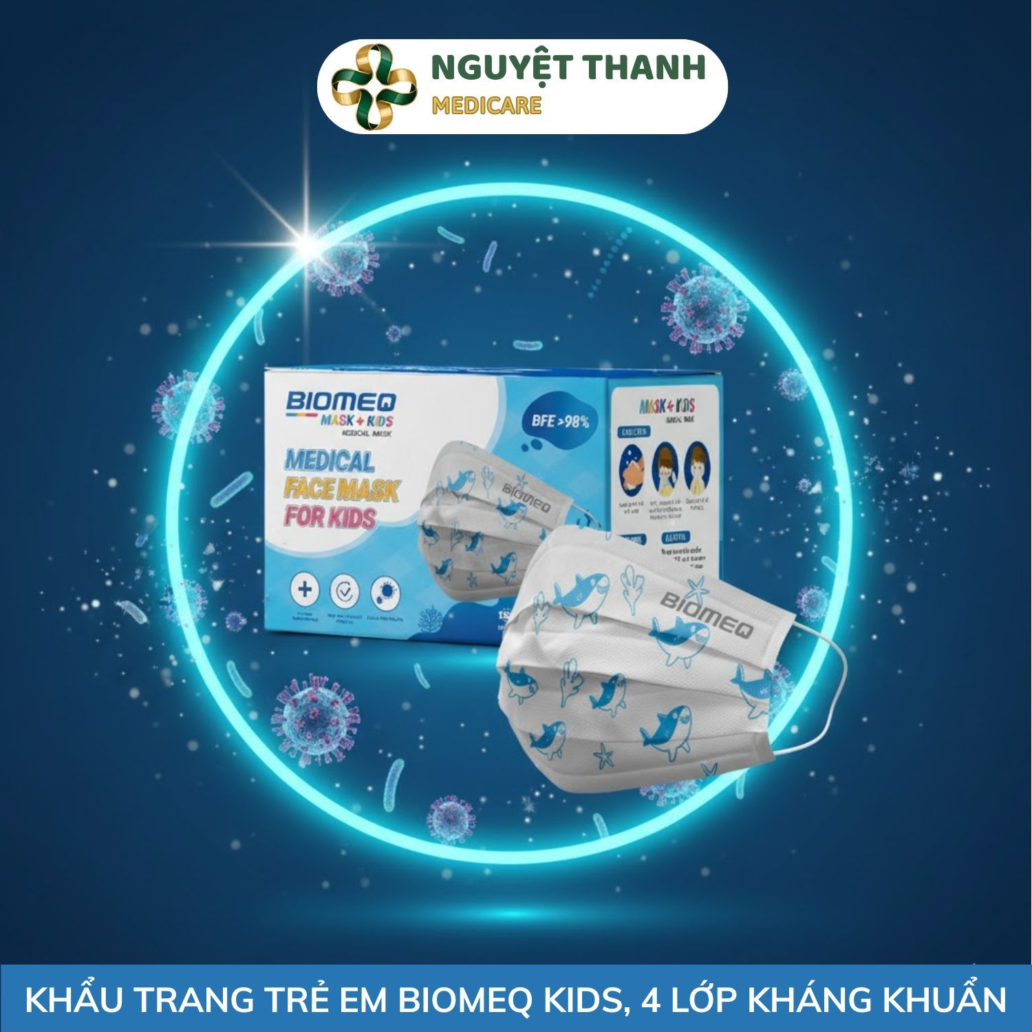 Khẩu trang y tế 4 lớp kháng khuẩn Biomeq Mask+ Kid là giải pháp bảo vệ sức khỏe toàn diện cho trẻ em, giúp ngăn chặn hiệu quả giọt bắn, khí thải, và bụi mịn. Sản phẩm sử dụng siêu màng lọc chuẩn y tế Meltblown, có khả năng tiêu diệt hơn 98% vi khuẩn, đảm bảo không khí bé hít thở luôn sạch sẽ và an toàn. Sản phẩm này hiện đang được Thiết Bị Y Tế Nguyệt Thanh Cần Thơ phân phối trên toàn quốc.
