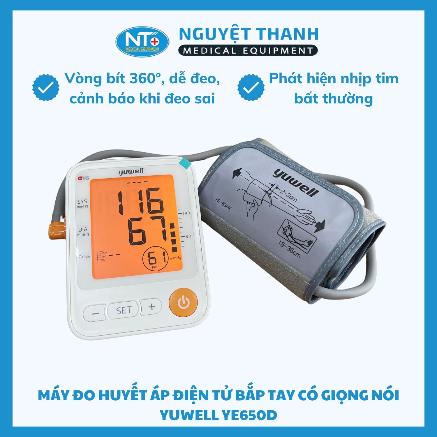 Máy đo huyết áp điện tử bắp tay Yuwell YE650D giọng nói tiếng Việt là giải pháp tuyệt vời cho người cao tuổi và gia đình cần theo dõi huyết áp mỗi ngày. Tính năng dễ sử dụng, độ chính xác cao cùng bảo hành 5 năm giúp sản phẩm trở thành một trong những mẫu được tin dùng nhất hiện nay. Thiết Bị Y Tế Nguyệt Thanh cam kết mang đến sản phẩm chính hãng – giá tốt – dịch vụ tận tâm.
