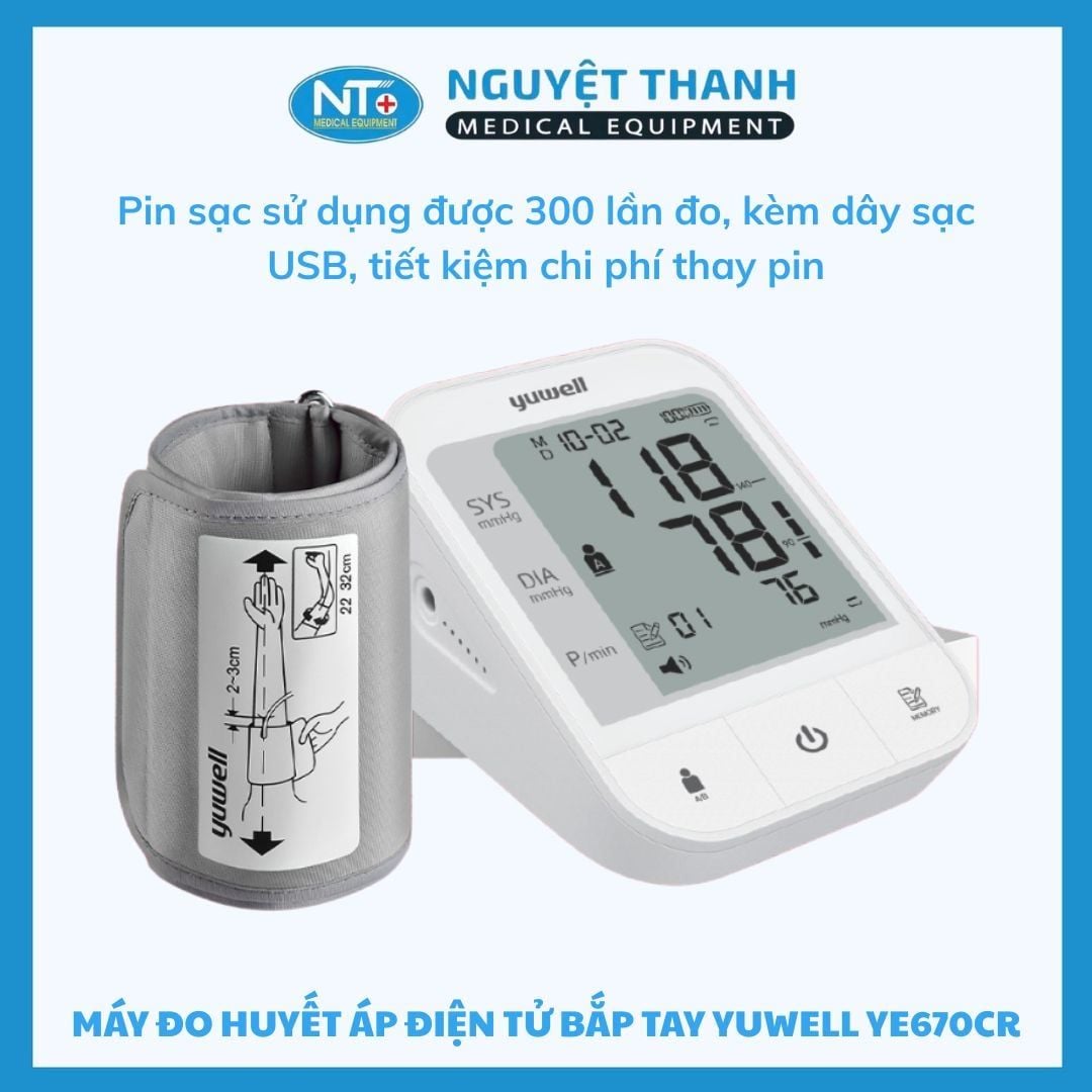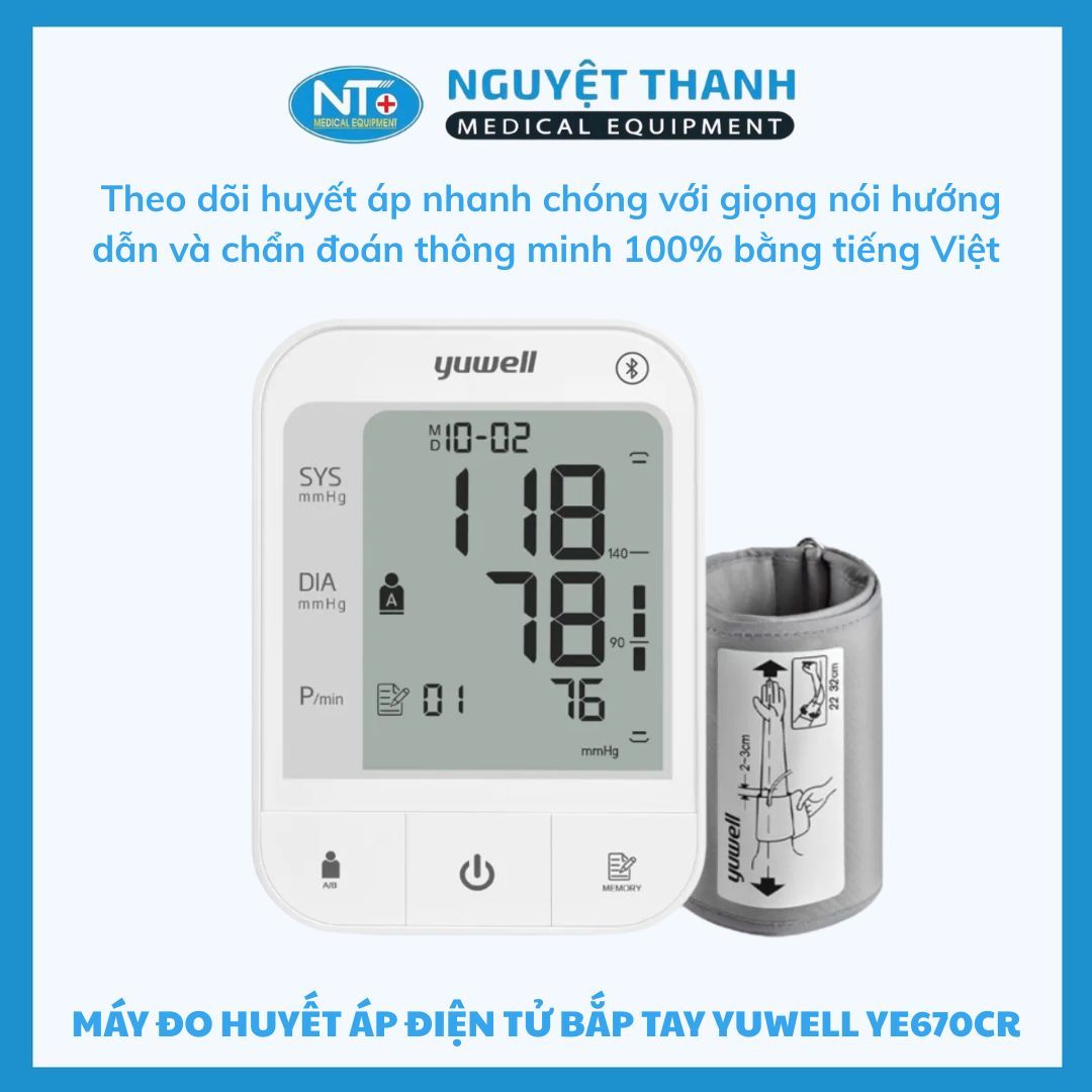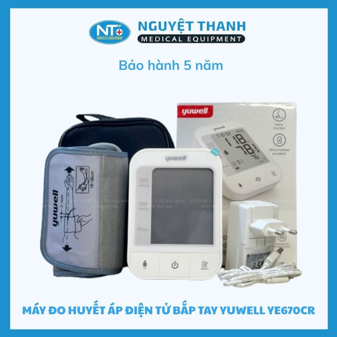 Máy đo huyết áp giọng nói Yuwell YE670CR là phiên bản mới nhất được Thiết Bị Y Tế Nguyệt Thanh phân phối trên toàn quốc. Sản phẩm nổi bật với giọng nói tiếng Việt 100%, pin sạc dùng đến 300 lần đo, vòng bít 360° chống cuốn sai, giúp người dùng theo dõi huyết áp dễ dàng và chính xác ngay tại nhà.