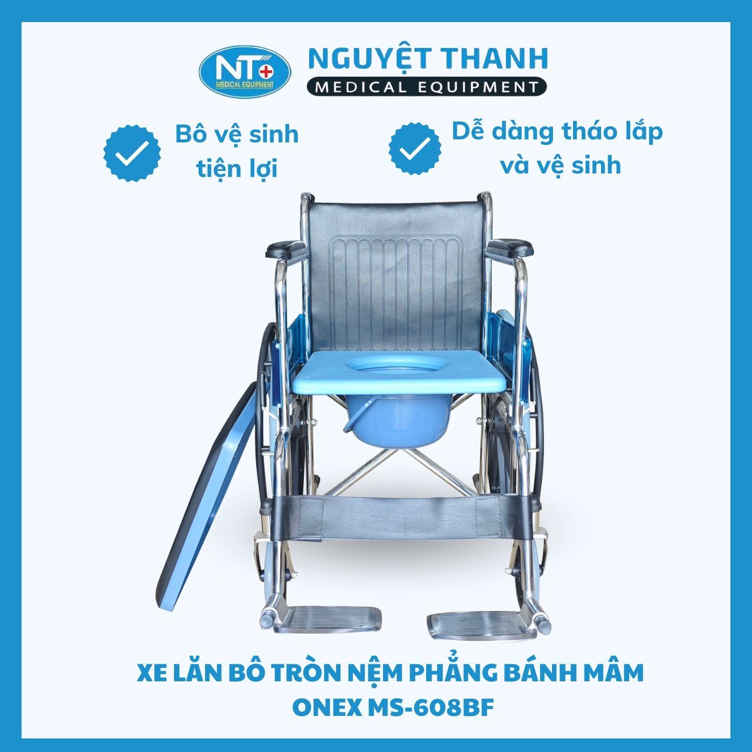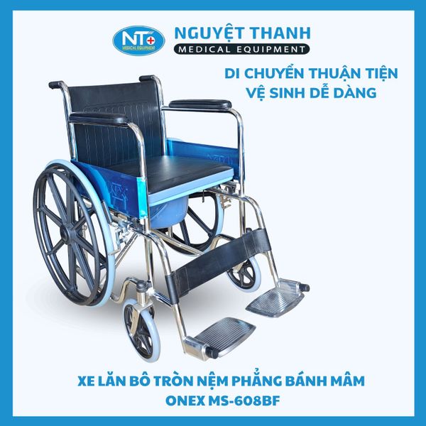 Xe lăn bô MS-608BF (Bản Bánh Mâm) là thiết bị y tế cao cấp, kết hợp giữa xe lăn di chuyển và bô vệ sinh cá nhân, nhằm mang lại sự tiện nghi và độc lập tối đa cho người già, người khuyết tật, hoặc bệnh nhân cần phục hồi chức năng. Điểm nổi bật là hệ thống bánh mâm đúc (Solid Wheel) chắc chắn, không cần bơm hơi cùng với khung thép mạ crom bền bỉ. Sản phẩm giúp giảm thiểu công sức chăm sóc và tăng chất lượng cuộc sống cho người sử dụng. Sản phẩm này hiện đang được Thiết Bị Y Tế Nguyệt Thanh Cần Thơ phân phối trên toàn quốc.