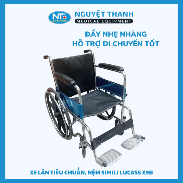 Xe Lăn Simili, Bánh Mâm Lucass X9B là mẫu xe lăn tay tiêu chuẩn, được thiết kế chắc chắn, bền bỉ và tiện lợi, giúp người già, người khuyết tật, hoặc bệnh nhân phục hồi chức năng di chuyển dễ dàng và độc lập hơn trong sinh hoạt hàng ngày. Với khung thép sơn tĩnh điện, đệm simili êm ái, và thiết kế gấp gọn, X9B là lựa chọn kinh tế và hiệu quả. Sản phẩm này hiện đang được Thiết Bị Y Tế Nguyệt Thanh Cần Thơ phân phối trên toàn quốc.